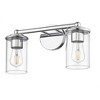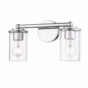 Introduce crisp, modern style and bright illumination over a vanity or in your bathroom with a contemporary two-light vanity fixture. Showcasing timeless design details, its frame receives a chic brushed nickel finish while clear glass allows full view of the bulb within, great for grooming and beauty rituals. Material: Steel, Finish Color: Brushed Nickel, Width: 16", Height: 8.75", Depth: 5.75", Backplate Width: 4.7", Backplate Length: 4.7", Lamping Type: Incandescent, Number Of Bulbs: 2, Wattage: 60 Watts, Dimmable: Yes, Moisture Rating: Damp Rated