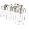 Smooth curves and understated design collide to create a striking silhouette for a Thayer modern three-light vanity fixture. Beautiful over a sink or brightening a free-standing vanity, this gorgeous fixture features a sleek brushed nickel finish paired with clear glass that provides bright, true illumination for everything from shaving to putting on makeup in the morning. This three-light design is ideally sized for a medium vanity or single sink.