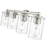 Appreciate the versatility of modern simplicity in a chic, modern four-light vanity fixture. From the Thayer collection, it's a charming, understated design that pairs graceful curvature with a refined brushed nickel finish and cylinders of crystal clear glass for bright, direct illumination ideal for a master or guest bath. Material: Steel, Finish Color: Brushed Nickel, Width: 30.75", Height: 8.75", Depth: 5.75", Backplate Width: 4.7", Backplate Length: 4.7", Lamping Type: Incandescent, Number Of Bulbs: 4, Wattage: 60 Watts, Dimmable: Yes, Moisture Rating: Damp Rated