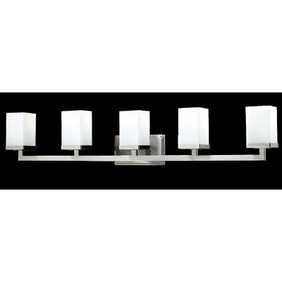This two light vanity fixture provides a clean modern look with its use of rectangular matte opal shades and brushed nickel geometric inspired hardware. This fixture can either be hung up or down, depending on the needs of the user. Material: Steel, Finish Color: Brushed Nickel, Width: 13.25", Height: 8", Length: 5", Depth: 5", Backplate Width: 4.5", Backplate Length: 8", Lamping Type: Incandescent, Number Of Bulbs: 2, Wattage: 100 Watts, Dimmable: Yes, Moisture Rating: Damp Rated