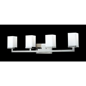 This four light vanity fixture provides a clean modern look with its use of rectangular matte opal shades and chrome geometric inspired hardware. This fixture can either be hung up or down, depending on the needs of the user. Material: Glass, Finish Color: Chrome, Width: 33.25", Height: 8", Length: 5", Depth: 5", Backplate Width: 4.5", Backplate Length: 8", Lamping Type: Incandescent, Number Of Bulbs: 4, Wattage: 100 Watts, Dimmable: Yes, Moisture Rating: Damp Rated