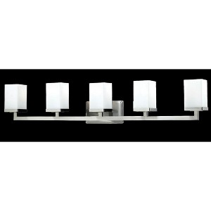 This five light vanity fixture provides a clean modern look with its use of rectangular matte opal shades and brushed nickel geometric inspired hardware. This fixture can either be hung up or down, depending on the needs of the user. Bathroom/Powder Room Mounting Direction: Up/Down Shade Included: Yes Dimmable: Yes Material: Steel, Finish Color: Brushed Nickel, Width: 40", Height: 8", Length: 5", Depth: 5", Backplate Width: 4.5", Backplate Length: 8", Lamping Type: Incandescent, Number Of Bulbs: 5, Wattage: 100 Watts, Dimmable: Yes, Moisture Rating: Damp Rated