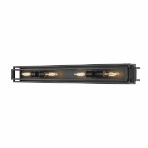 Create a sophisticated industrialized feel to spacious bathroom retreats and communal powder rooms with this grand four-light vanity fixture. Set within an elongated matte black cage made of slim steel frames, two sets of fixtures with exposed bulbs at each end create a soft illumination across vanity countertops, creating a modern architectural look and feel. This large black vanity fixture makes a perfect opportunity to offer the romantic flicker of traditional Edison style bulbs, creating a chic contemporary retreat.