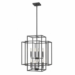 An oversized steel cage offers a grand minimalist aesthetic to this contemporary eight-light pendant, designed with an elegant geometric tesseract-inspired shape. Modernizing spacious transitional interiors like a two-story entryway foyer or an open concept living room with high ceilings, this substantial transitional pendant boasts a stark matte black finish that presents a modern architectural feel and Frank Lloyd Wright-inspired aesthetic. This generous contemporary pendant shade offers a breathable design, showcasing eight candelabras topped with exposed bulbs, pushing the cleverly designed architectural mood.