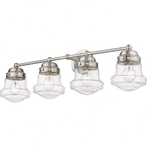 Indulgent village-inspired charm mixes nautical with industrial, forming a themed look that lifts the ambiance in any bath space. This four-light vanity light from the Vaughn collection embellishes a mid-size bathroom with a contrasting blend of matte black finish steel and matte opal glass shades in a schoolhouse silhouette. Dimmable: Yes Shade Included: Yes