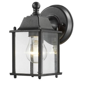Black cast aluminum rectangular hardware compliments the clear beveled glass on this unique yet traditional outdoor wall light. Outdoor Living Shade Included: Yes Dimmable: Yes Material: Aluminum, Finish Color: Black, Width: 6", Height: 8.375", Length: 4.375", Depth: 4.38", Backplate Width: 4.75", Backplate Length: 4.75", Lamping Type: Incandescent, Number Of Bulbs: 1, Wattage: 100 Watts, Dimmable: Yes, Moisture Rating: Wet Rated