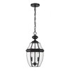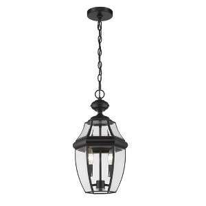 This two-light outdoor chain mount ceiling fixture adds a classic silhouette to the lighting in your patio, deck or porch area. With its candelabra composition, the lamp provides soft, effective illumination. A multi-sided clear beveled glass shade has a black steel frame, creating an elegant impression. Outdoor Living/Porch/Patio Shade Included: Yes Dimmable: Yes
