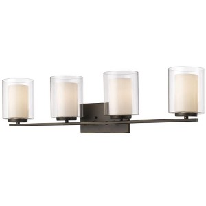 Clean, graceful lines of the arms + glass shades define the Willow family. Brushed nickel fixtures and inner matte opal with clear outer glass shades create clean and unique designs. Bathroom/Powder Room Mounting Direction: Up/Down Shade Included: Yes Dimmable: Yes Material: Glass, Finish Color: Brushed Nickel, Width: 31.5", Height: 7.75", Length: 6", Depth: 6", Backplate Width: 4.5", Backplate Length: 8", Lamping Type: Incandescent, Number Of Bulbs: 4, Wattage: 100 Watts, Dimmable: Yes, Moisture Rating: Damp Rated