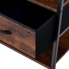 Elevate your bedroom's style with our Rustic Industrial Nightstand. This three-tiered nightstand features a vintage brown top and drawer front, complemented by a sleek black metal frame, offering a perfect blend of rustic charm and modern industrial design. The spacious top tier is ideal for placing your lamp, phone, or favorite book. The middle drawer provides convenient storage for small items, while the bottom shelf offers additional space for magazines or decorative items. Measuring 15.7"W x 11.8"D x 23.6"H, it fits well in any bedroom corner. The non-slip feet ensure stability on all floor types. Bring a touch of elegance and functionality to your space with this versatile nightstand.