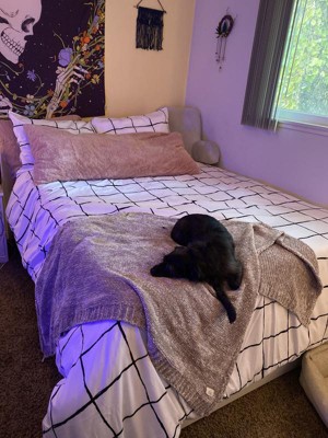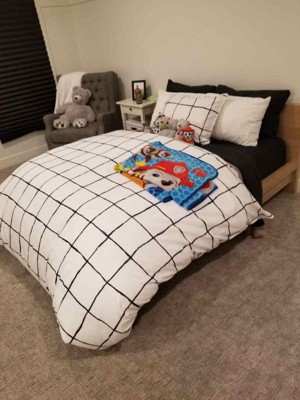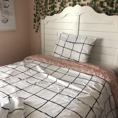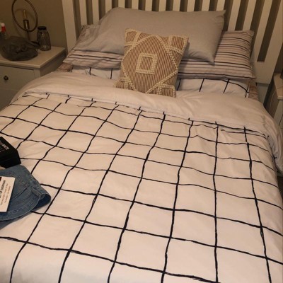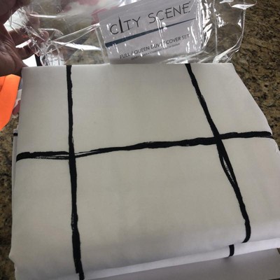 A: Thank you for your inquiry. The City Scene zander duvet set features black brushstrokes on a crisp white background that creates a bold windowpane check that is graphic while still reflecting the artist’s hand.