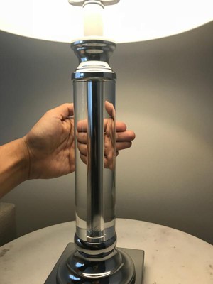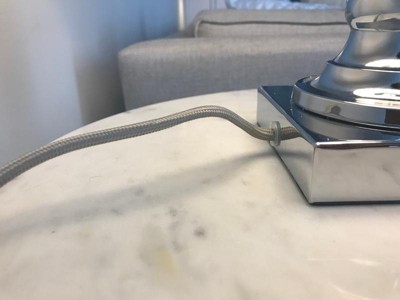 The lamps are great quality. Includes two LED lightbulbs, and shipped together. Well packaged & no damage! Chord length is about 5’ & braided grayish cable. The shade is chrome and the screw top is clear glass/crystal. They turn on with a standard twist knob. Base has felt. The measurements are spot on. The footprint is about 4” x 4”