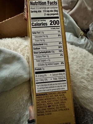 ingredients: enriched long grain parboiled rice (rice, iron, niacin, thiamine mononitrate, folic acid), salt, onion, yeast extract, red and green bell pepper, sugar, garlic, hydrolyzed soy protein, spices (including turmeric, red pepper, paprika), brown sugar, citric acid & natural flavor.