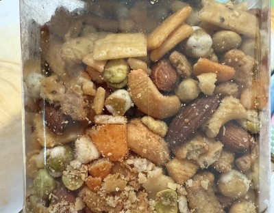 - Made with rice crackers, sesame sticks, fried green peas, almonds, cashews and wasabi peas