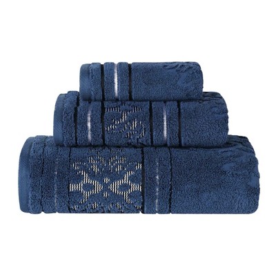 Zero Twist Cotton Solid and Floral Jacquard Face Towel Washcloth Set of 12, Navy Blue - Blue Nile Mills