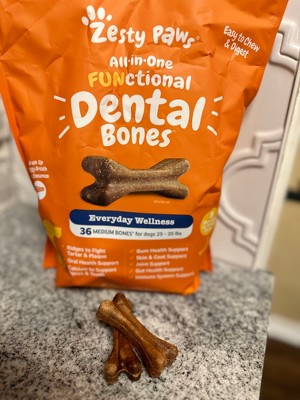 [This review was collected as part of a promotion.] My medium size, senior dog Bella loves the Zesty Paws all in one functional Dental Bones. For her it is a treat, for me i know it is something good for her and takes care of her teeth and gums,