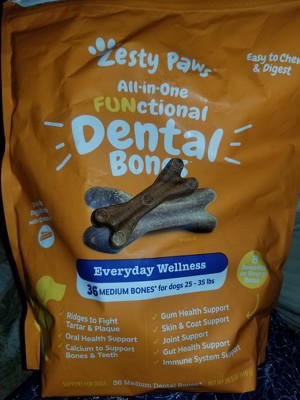 [This review was collected as part of a promotion.] My dog loves Zesty Paws Dental Treats and is excited to see me grab the bag every morning to give her one. I like that these dental treats by Zesty Paws are made to be easily chewed helping my dog get better breath and cleaner gums. I also like that these have ingredients to help my dogs joint mobility. Definitely a product I will keep purchasing.