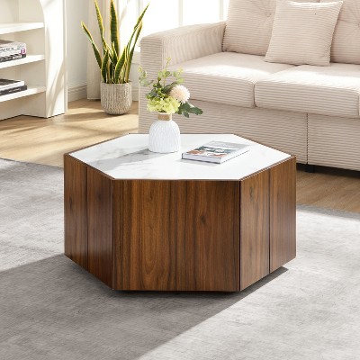 Zeus & Ruta Hexagonal Rustic Retro Coffee Table with 2 Hidden Drawers, Marble Top & Oak Finish for Living Room