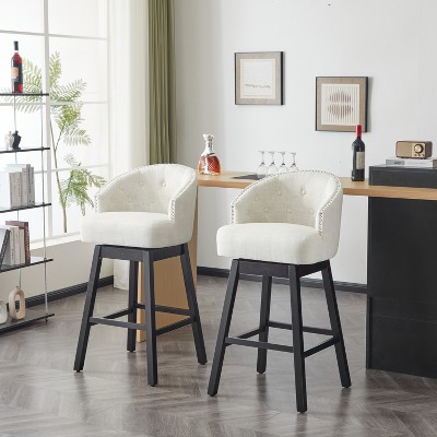Elevate your kitchen or dining space with these stylish mid-century barstools, crafted from premium, thick velvet fabric for a soft and luxurious feel. Featuring a high backrest adorned with decorative rivets, they offer both elegant aesthetics and comfortable support for extended seating. The cushion is designed with high-density foam and a resilient steel spring inner structure, ensuring excellent comfort and durability. Built with a solid wood frame and sturdy legs, each stool supports up to 300 pounds and includes adjustable pegs for stability on uneven floors. Complete with handcrafted details such as pull-ups and hemming on the backrest, these stools add warmth and sophistication to any room. Easy to assemble with included instructions and tools, they blend timeless design with everyday functionality.