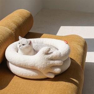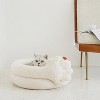 A round bolster cat bed with wraparound sides and soft fleece. The elevated edges create a supportive enclosure for curling and lounging. Constructed with polyester fabric and filling for warmth and everyday comfort. Neutral cream tone blends with modern interiors and is designed for indoor use.