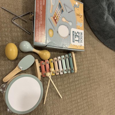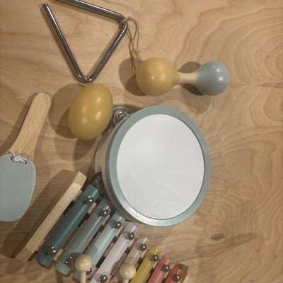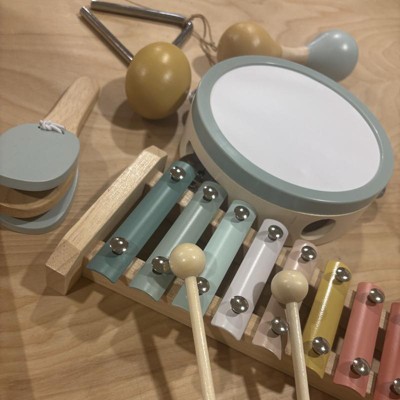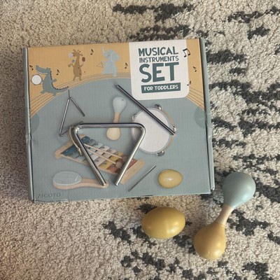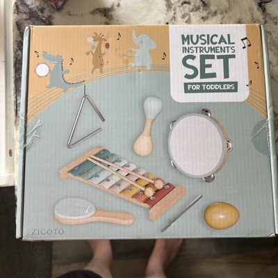 [This review was collected as part of a promotion.] The Zicoto Musical Instrument Set came with a good variety of wooden and metal instruments. It has maracas, a tambourine, xylophone, triangle, egg rattle, and clapper. They all actually sound and play like you would expect them to. The xylophone is tuned well, although my toddler prefers to play it by hitting it with the metal triangle... nothings broken yet, so looks like it should last. I received an incentive to write this review.