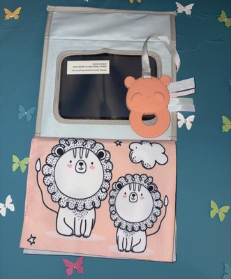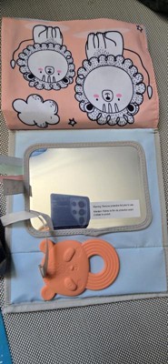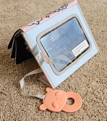This is a very cute simple baby toy. The pages are soft with simple pictures for your baby to look at. It folds out to stand on its own so your baby could look at themselves in the mirror in the back of the book. There is also a teething toy attached to it.