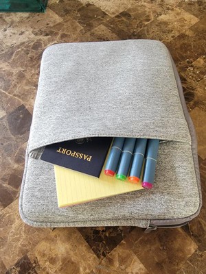 Nice design, great feel! Though the sleeve/case only zips across the top, we have not had any issues with getting our laptop in easily. The gray cotton design looks nice, the front pouch can easily accommodate stationery, paperwork, phones and cables as well as a laptop mouse. What I personally like the most - the padding inside the laptop sleeve. Very soft and padded on both, the top as well as the bottom.