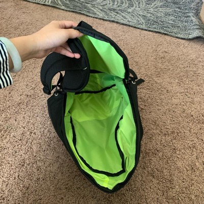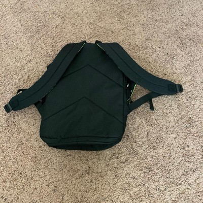 [This review was collected as part of a promotion.] This backpack has a decent amount of space in it. It is black with fluorescent lime green trim, which is probably a good safety feature. It really only has one zipper opening. It has two side elastic bottle holders and then it has a front pocket which opens on a big chunky zipper that’s meant to look like the teeth . The straps are padded and comfortable and it’s a really fun bag.
