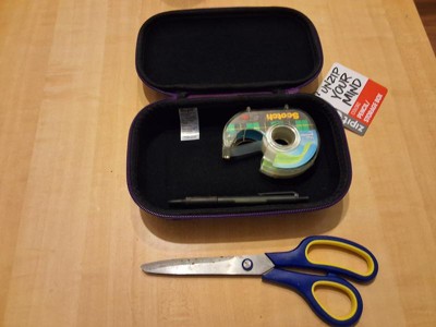 This pencil case has a cute print that has a nice quality feel to it along the outside. The case is firm and durable but not hard like plastic. The inside is nicely padded and has plenty of room. It can fit tape, glue, mini-scissors, and pens/pencils. Not as elaborate as some of zip-it's products but has a more "grown-up" design.