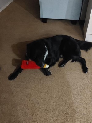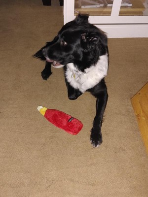 My puppy is loving his new hot sauce! I thought this was such a creative toy and have been pleasantly surprised by how well it’s held up. My dog is notorious for tearing apart his toys in a matter of hours but after three days of play, it’s still intact! It has lots of features that make it interesting and seem to stimulate him in different ways - a soft exterior, a crunchy plastic bottle, and a squeaker. The one downside is that it can be a little noisy when he really gets going with it but since playing with it makes him so happy, I’m willing to put up with the crunches and squeaks!