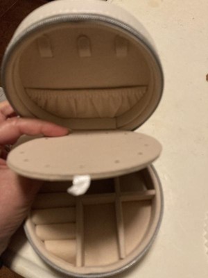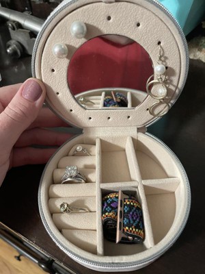 [This review was collected as part of a promotion.] This is a great little case to keep jewelry in! It closes securely with a zipper, and when you open it up, there’s a spot for rings and other compartments. Also, a mirror! The inside opens up to another compartment to give to so many options. i can’t wait to take this on vacation later this month and my daughter has also decided her stuff can fit in, as well :).