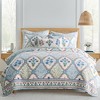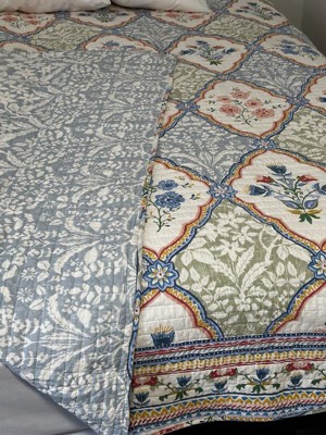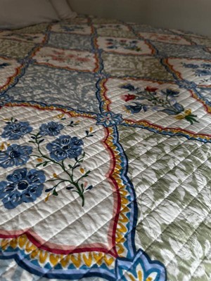 The Zoey Reversible Quilt by Levtex Home is inspired by vintage French textiles. Offered in blue, yellow, green, pink and white, this design will immediately transform your bedroom. This reversible quilt features diamond lattice floral on the front, reversing to delicate blue flowers on a white ground. The Quilt is cotton front and back, filled with a cotton-rich filler and is machine washable. Enjoy this for years to come!