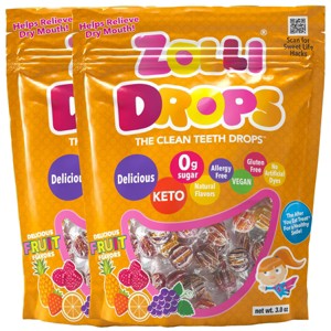 Zolli Drops Natural Assorted Fruit, Clean Teeth Candy, are delicious, healthy, natural, vegan, KETO, allergy friendly, diabetic friedndly,sugar free, non-GMO, gluten free, dairy-free, kosher and made with natural flavors and colors. Zolli Drops are the perfect healthy treat that everyone can enjoy! After You Eat Treat, enjoy one after every meal, for a cleaner, healthier smile! Zolli Drops help relieve dry mouth!