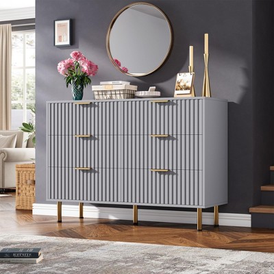- Sophisticated Fluted Design with Metallic Accents: Featuring elegant fluted panels and gleaming gold-tone leg supports, this dresser delivers a luxurious, modern aesthetic ideal for elevating bedroom decor or complementing living spaces.