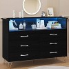 This modern MDF dresser integrates 3 AC outlets + 2 USB ports (including LED power), features music-syncing RGB mood lighting, offers 6 drawers + open shelves for storage, boasts scratch/water-resistant construction with metal legs, and includes hassle-free assembly with support.