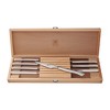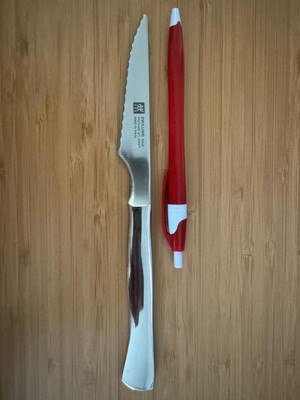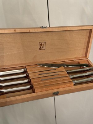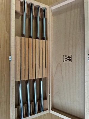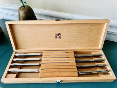 This Zwilling 8-piece steak knife set enhances your eating experience. Slice through steak, pork chops, and chicken cutlets with these 4-inch ultra-sharp blades. Housed in a sleek wooden case, conveniently store and display your steak knives.Beautiful and practical, these knives are fabricated with high-quality German stainless steel. The fully forged bolster construction seamlessly transitions from blade to handle for durability, balance, and striking design. The tapered handle offers a comfortable, ergonomic grip. Zwilling cutlery is dishwasher safe, hand washing recommended.