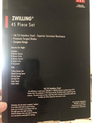 [This review was collected as part of a promotion.] I bought the 18/10 Stainless Steel 45pc Angelico Set. I just love the look of the handles. It has a comfortable weight to each piece of silver wear. I have purchased a knife set from Zwilling and trust the brand. So happy with this purchase. Will continue to buy pieces from them.