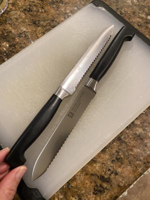 [This review was collected as part of a promotion.] I received this knife as a gift and love it! I reach for it for so many kitchen chores. It is great for cutting tomatoes and so many other foods. Slices very thin if you prefer and doesn't just butcher what you are cutting. I hope to get many years of use out of this knife and have just purchased the 2 pc. prep set because I am so impressed with this knife.