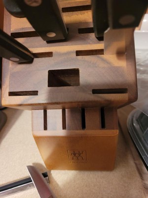 Block doesn't fit knives well, the slots are too wide and the knives move around too much. Also the slots aren't spaced right for this set. Disappointing. The 2 small pairing knives overlap the scissor handles when in their proper slot. The block looks nothing like the photo online. Totally different color.