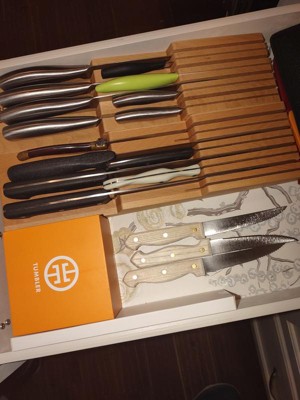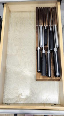 [This review was collected as part of a promotion.] This seems the best combination of spacesaver quality and function for available at this price point. Wood is attractive and solid. Our current home has less kitchen counterspace and this takes up only part of a small drawer compared to the bulky knife block we used previously. The only improvement might be a slightly more depth for larger heavier knives. Although it accommodates the length and width, our larger chef knife the weight of the knife handle causes the blade tip to pop up slightly. Not a significant issue as all its just this one knife and it sits in the groove enough toward back of draer to not pose a hazard.