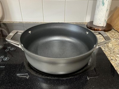This pan is the perfect size for 2 person meals. Great non-stick surface and cleans very easily. Nice weight, sturdy but not difficult to lift. Local store where I purchased recommended heating on a medium to low heat due to the non-stick surface, and that has worked fine for browning and cooking. Really like this pan and would highly recommend.