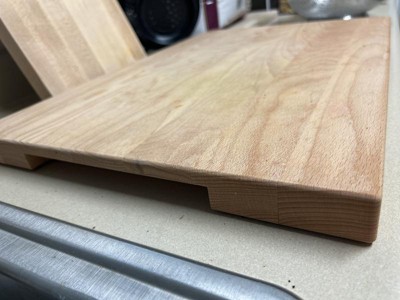 Large board with easy to grip hand holds. Light natural beechwood color looks attractive on any counter. Like all hardwood boards, this board will require regular application of a food grade mineral oil; but the effort is well worth it. This board will reward the care with years and years of cutting. Good for knives. Very good price for the size and thickness of the board.