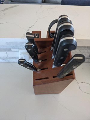 This block holds Zwilling Pro knives perfectly. The slanted block accommodates the curved bolster shape. There is plenty of room for knives and tools.