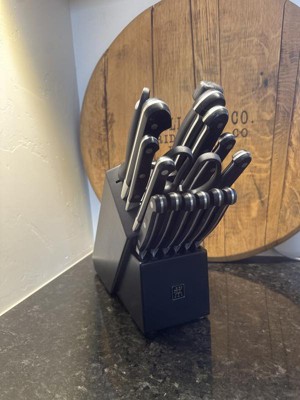ZWILLING Pro is the most user-friendly knife available to market. The unique blade shape and ergonomic bolster are the result of years of experience in knife making, and the rigorous study of how knives are used. A unique curved bolster supports the professional pinch grip, with thumb and index finger on the blade, for safe cutting and less fatigue. The Chef's Knife blade was redesigned with a broader curve in the front to facilitate the rocking motion of Western cutting, while the straight back is ideal for the Asian chopping motion. The full length of the blade can be used when cutting and can be sharpened from bolster to tip. Designed in Italy by Matteo Thun and made in Germany by ZWILLING J.A. Henckels, the company that sets the standard for exceptional cutlery worldwide.Set includes 3" Paring Knife, 4" Paring Knife, 5" Serrated Utility Knife, 5.5" Prep Knife, 7" Santoku Knife, 8" Bread Knife, 8" Chef's Knife, 4.5" Fine Edge Steak Knives (6), TWIN Shears, TWIN Sharpening Steel, and 16 Slot Hardwood Block.