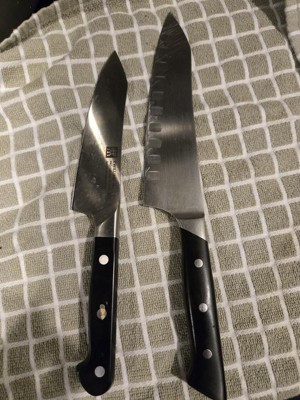 My wife liked the Santuko knife so much that she asked me to get this rocking sanutko knife too. She has used it every day since it arrived. What a great knife for slicing green onions, small onions bell peppers and so much more. Wonderful edge and well balanced. Nice indeed.