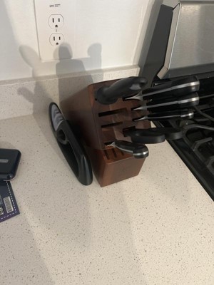- Set includes: 4-inch paring, 5.5-inch prep, 8-inch chef’s knife, 8-inch bread knife, kitchen shears, 9-inch honing steel, 2-stage knife sharpener, and 16-slot hardwood knife block