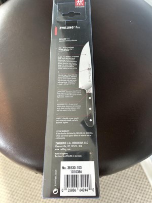 The 4-inch paring knife is essential for small-scale tasks like peeling vegetables, segmenting fruit, and slicing garlic. Make precise and detailed cuts with ease.ZWILLING Pro, the most user-friendly knife on the market, is now available with elegant matte white handles. ZWILLING Pro Le Blanc boasts a unique curved bolster that acts as an extension of the hand, supporting the professional pinch grip, with thumb and index finger on the blade, for safe cutting and less fatigue. The blade was designed with a broad curve in the front to facilitate the rocking motion of Western cutting, while the straight back is ideal for the Asian chopping motion. The full length of the blade can be used when cutting and can be sharpened from bolster to tip.