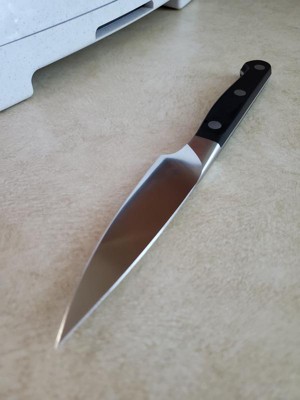 A superb paring knife, sharp, balanced and long enough to be used sometimes as a petty knife.