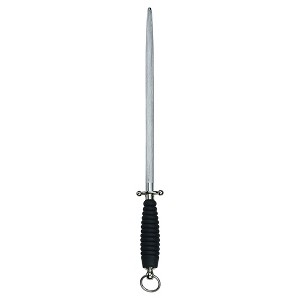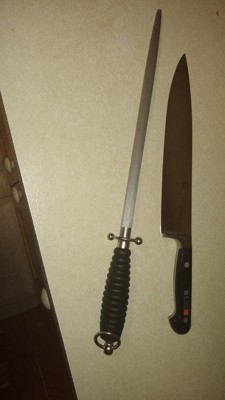 This 12-inch steel will handle any length knife in one smooth stroke. The heftier handle is designed for folks accustomed to the weight. The ridges on the handle are a help when hands are wet. The loop at the end is there to hang the steel from the prep table or on the wall. Made in Germany of quality durable steel. Will last, even with heavy daily use.