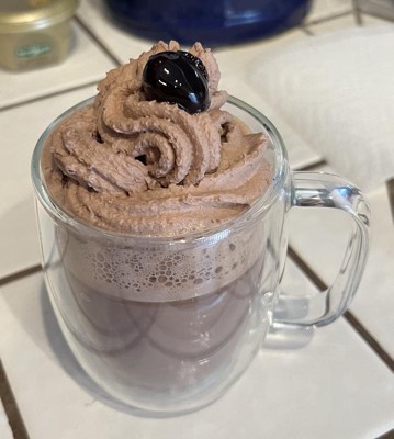 The cup has a nice feel in my hand, I can see the different layers of my hot chocolate topped with cocoa whipped cream.