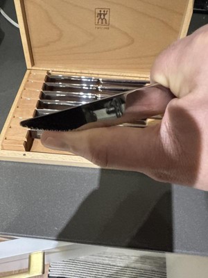 I love these steak knives because they are not big and bulky. Perfect with my new flatware set from Zwilling.